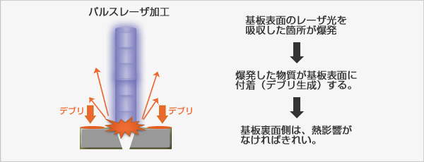 右図のように非熱加工の場合、アブレーションにより材料表面から飛散した物質が“デブリ”と呼ばれる微粒子となって材料表面に再付着し加工部周辺を汚してしまいます。デブリ発生はアブレーション加工において避けることのできない現象として知られています。このデブリは照射したレーザ光の波長に対し材料の吸収率が低い時ほど量が多くなる傾向にあります。